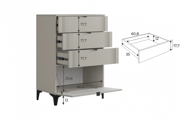 Металлические ручки и выкатные ящики на шариковых направляющих обеспечивают удобный доступ к вещам. Регулируемые металлические опоры гарантируют стабильность конструкции.